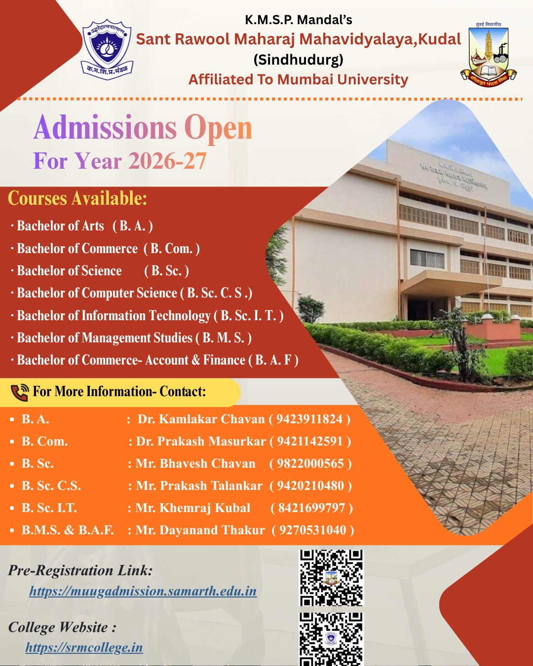 K.M.S.P. Mandal’s Sant Rawool Maharaj Mahavidyalaya, Kudal, established in 1984, is a prominent institution of higher education located at S. N. Desai Chowk, Udyamnagar, Kudal, in the Sindhudurg district of Maharashtra. The college is affiliated with the University of Mumbai and is dedicated to providing quality higher education to students from rural and semi-urban backgrounds.