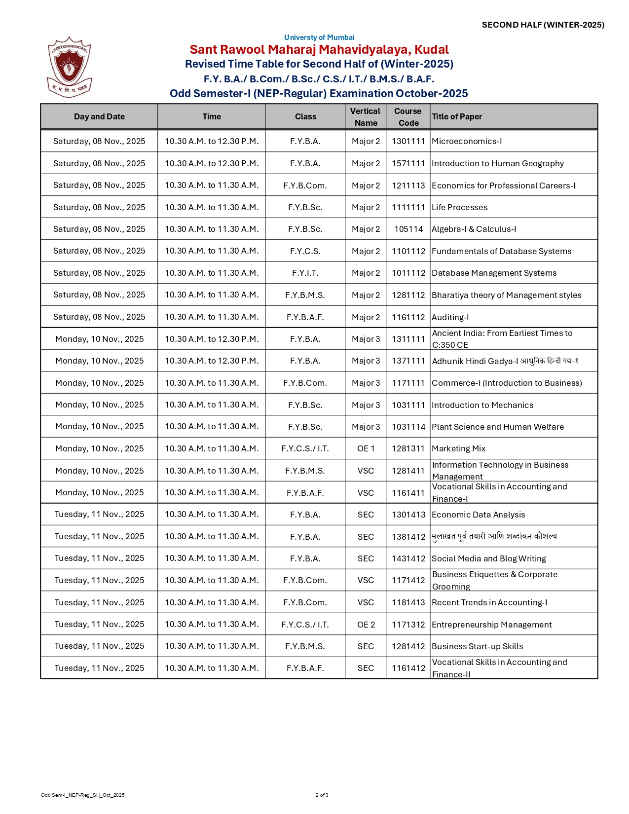 FY SEM – I (NEP Regular) Exam October-2025 Revised Time Table